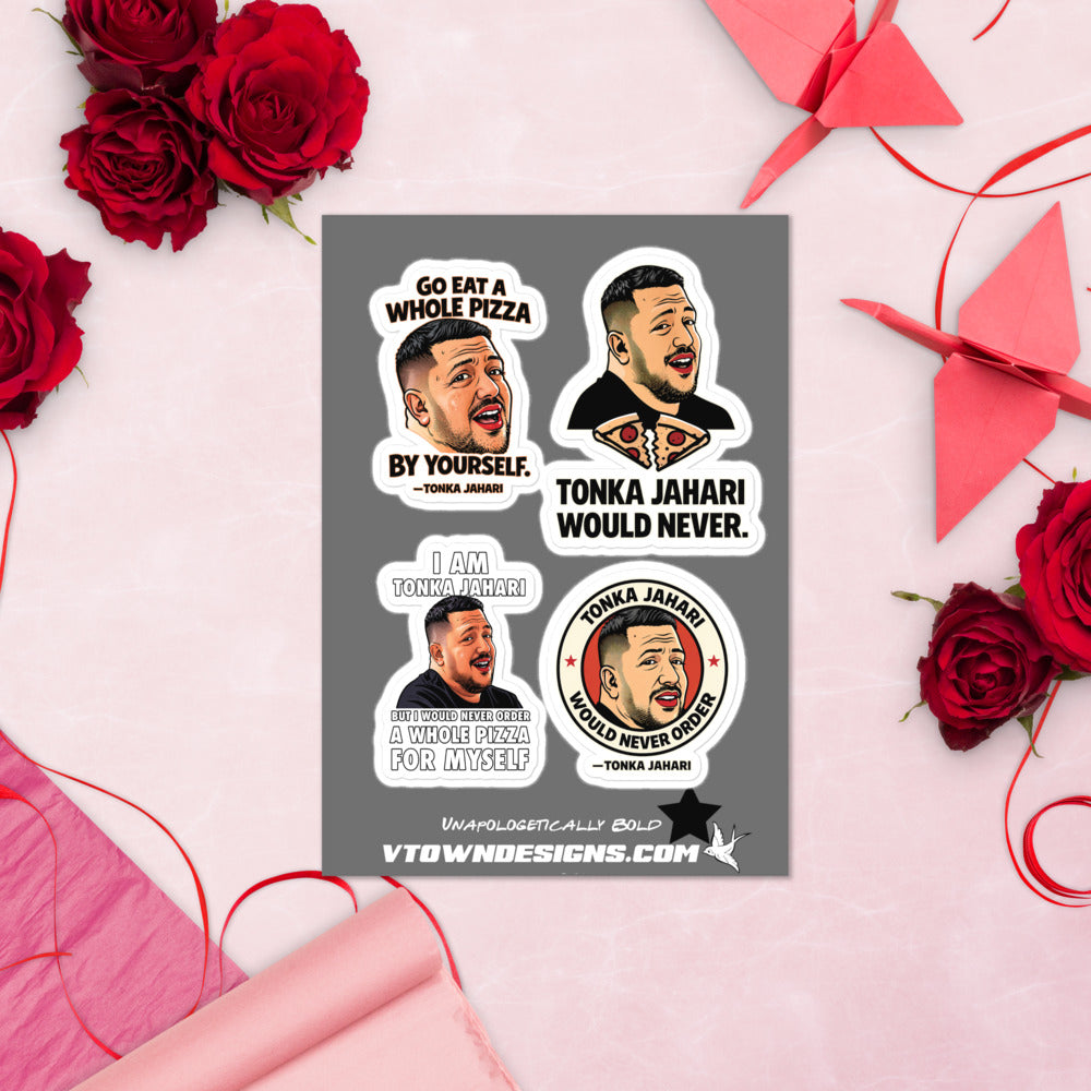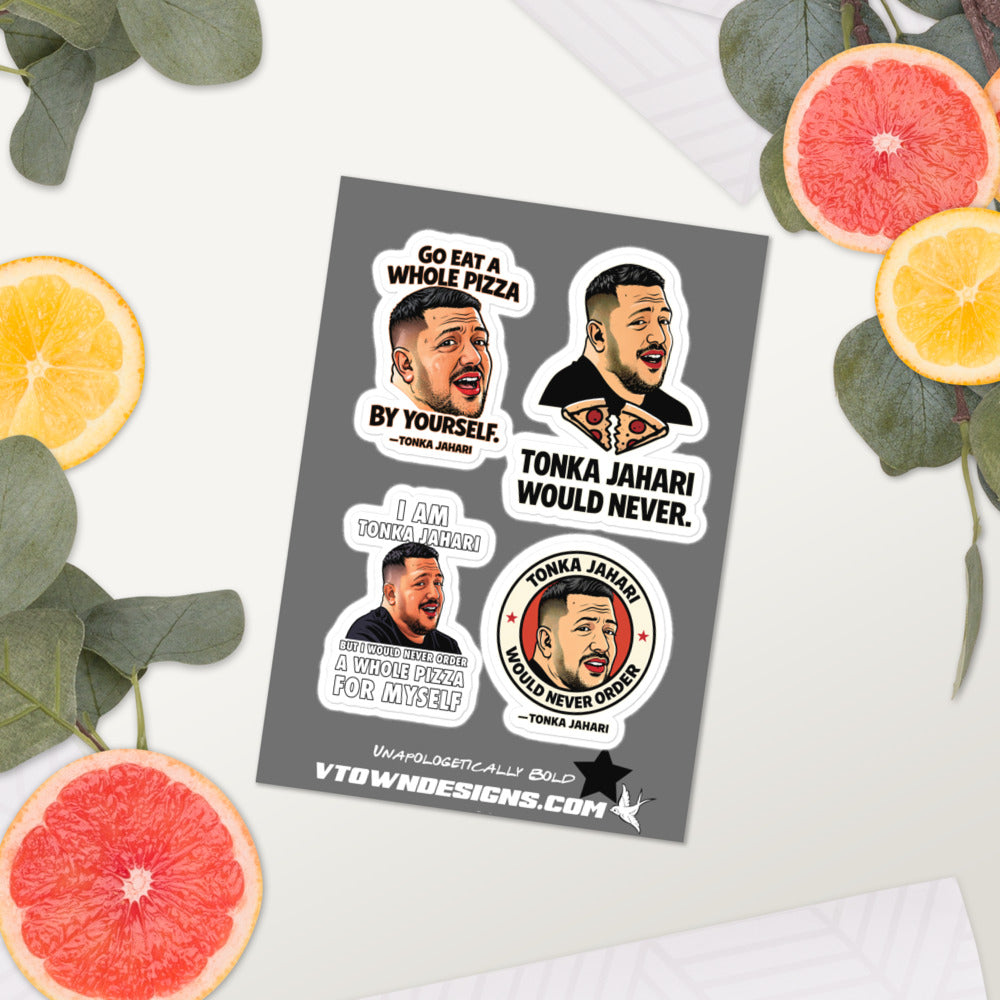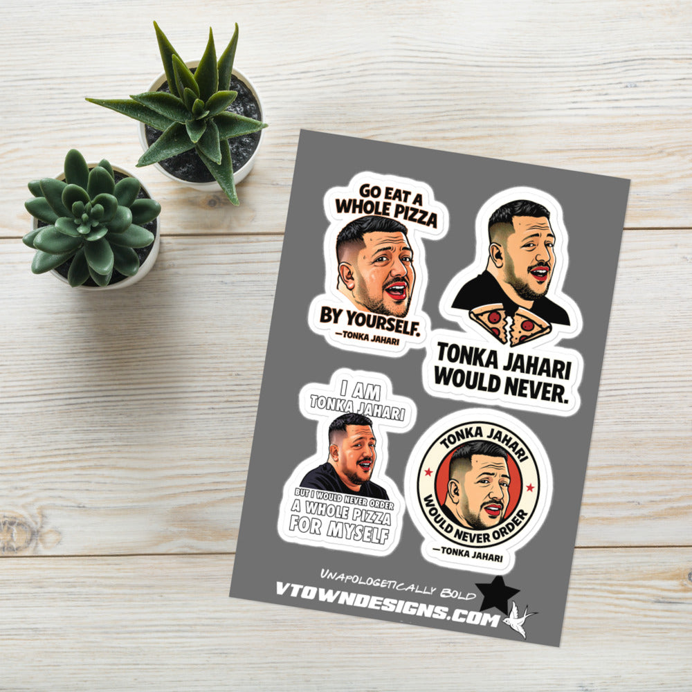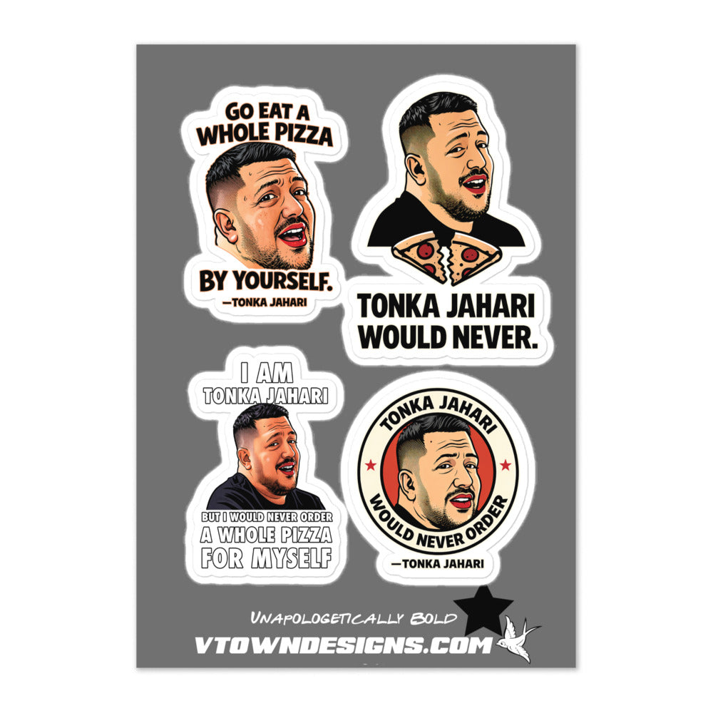 This Tonka Jahari sticker sheet features all four released designs from the collection. Each sticker carries a different line tied to the Impractical Jokers moment.